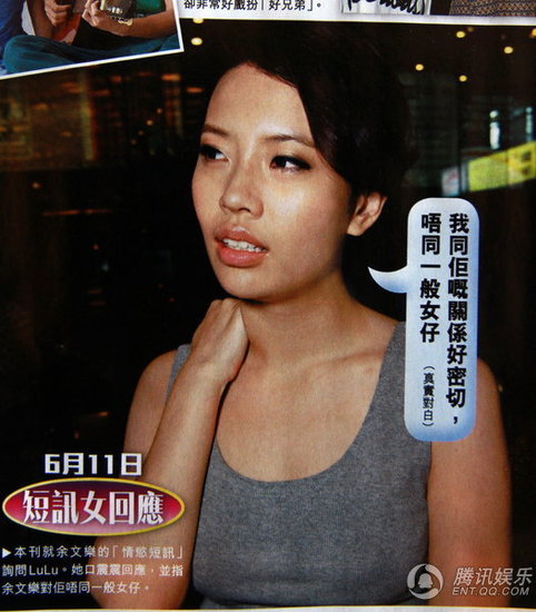 而据LuLu身边好友透露余文乐也曾向LuLu多次示爱:“有几次和Lulu去玩,余文乐半夜多狂打电话给LuLu,说自己醉了,要LuLu到他家陪他。但LuLu认为太主动,对方不会珍惜,所以LuLu会刻意放他飞机,她说男人犯贱,要若即若离才行。问她同余文乐有没有做过,她就比较隐晦,死都不肯说。”