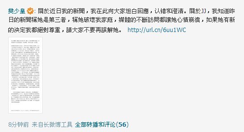 8月23日8时13分,樊少皇通过腾讯微博率先发表声明,剖析两段感情。樊少皇承认自己的确有过一段婚姻并育有子女,但表示已于4年前与妻子和平离婚,并且支付了抚养费,并非报道所说的抛弃妻子女。樊少皇同时也承认了与贾晓晨的新恋情,并且称她并非第三者。希望媒体不要打扰前妻和子女的生活,并称:“在此向大家坦白回应,认错和澄清。关于JJ,我知道昨日的新闻称她是第三者,称她破坏我家庭,媒体的不断访问都让她心情崩溃,如果她有新的决定我都绝对尊重,请大家不要再误解她。”