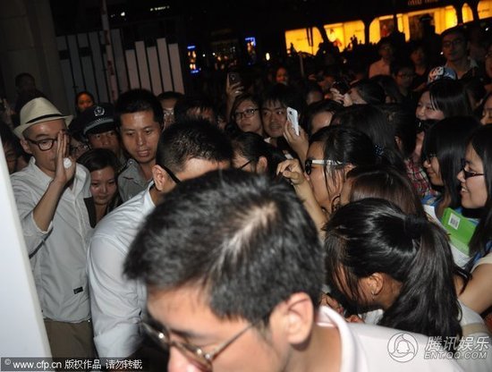 当日,胡歌的车子迟迟没有来,而其准备一路走到马路上等车,但是身后跟随了大批的粉丝,把他团团围住。无奈,其只能在临时安保人员的护送下,在活动场馆外的门卫室躲避等待。