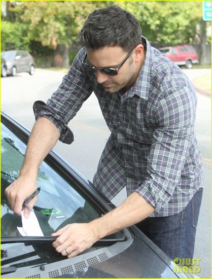 腾讯娱乐讯(图文/Justjared)当地时间10月6日,美国加利福尼亚,本·阿弗莱克将一张致歉便签夹在一辆停泊在路边的汽车的雨刷器下。因为他的错误驾驶撞碎了该辆汽车的车窗。