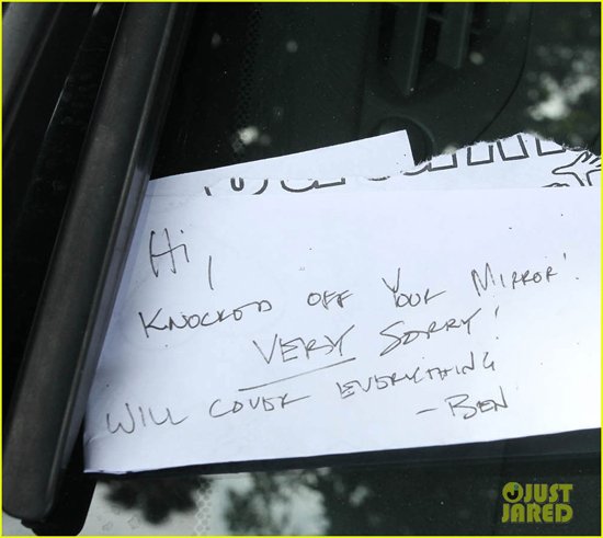 这位40岁的男演员在致歉便签上是这样写道:“嗨,撞坏了你的车窗。非常抱歉!我会负责一切的——本。”